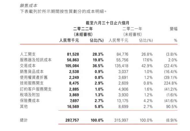 在中國有贊的銷售成本中,交易成本占比最多,其次為人工開支。2022年上半年,公司交易成本為1.05億元,同比減少22.5%;人工開支為8152.8萬元,同比減少3.8%。