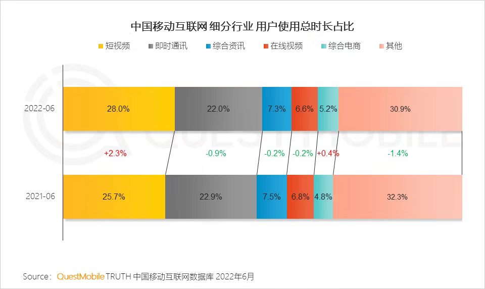 Questmobile顯示,2022年上半年中國移動互聯(lián)網細分行業(yè)用戶使用總時長占比中,短視頻用戶總時長占比達近三成,較2021年同比增長2.3%;而在線視頻用戶總時長則從6.8%跌至6.6%,用戶份額被進一步壓縮。