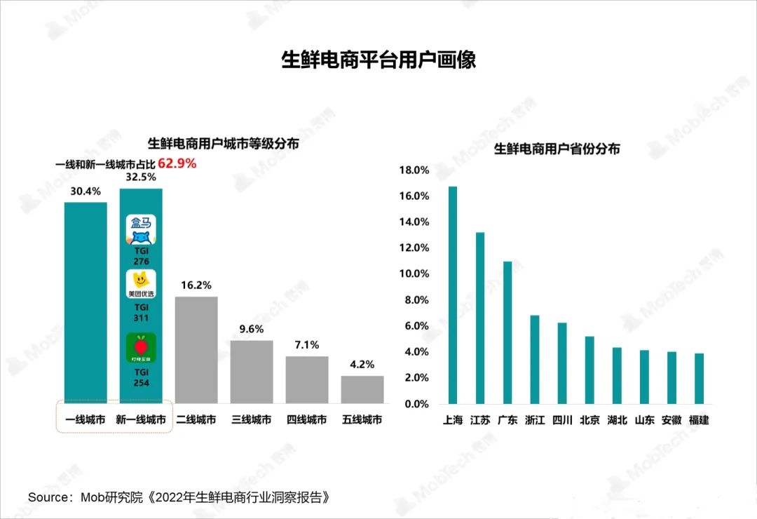 這么看來,叮咚買菜關閉多個城市站點,并非是壞事。Mob研究院的《2022年生鮮電商行業(yè)洞察報告》中有數(shù)據(jù)顯示,生鮮電商用戶主要集中在一線與新一線城市,占比達到了62.9%。