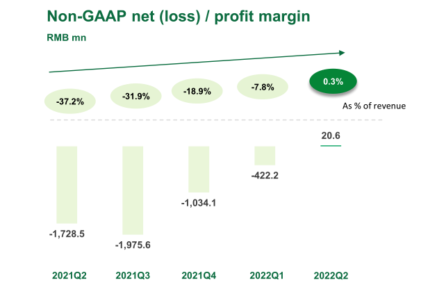 8月11日晚,叮咚買菜公布了2022年第二季度財報,第二季度營收為66.3億元,較2021年同期的44.5億元增長42.8%,首次實現(xiàn)階段性盈利,在非美國通用會計準則下(不計算激勵股權)實現(xiàn)了凈利潤2060萬元,而在美國通用會計準則下,凈虧損在3450萬元。