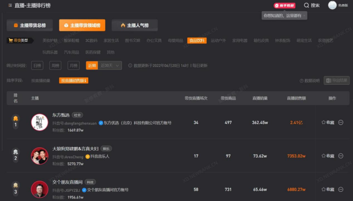 靠著雙語直播的獨(dú)辟蹊徑,東方甄選很快在抖音帶貨屆占據(jù)了一席之地。據(jù)新抖數(shù)據(jù)顯示,6月20日東方甄選以2.41億的銷售額排名第一,力壓了羅永浩曾經(jīng)的“交個(gè)朋友直播間”。
