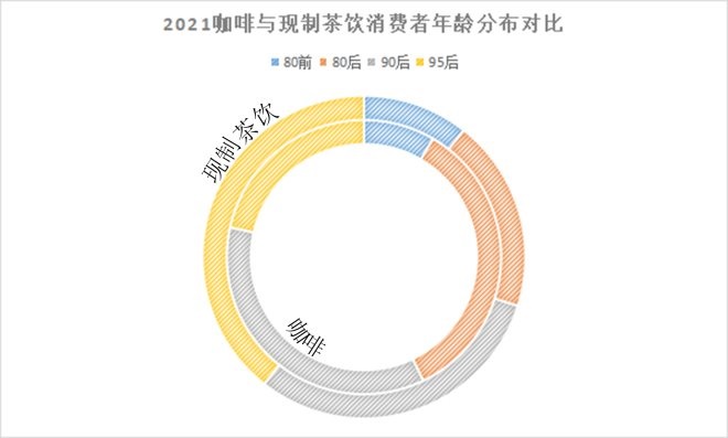 而從消費客群來看,根據(jù)Mob研究院數(shù)據(jù),2021年咖啡消費者年齡分布80前占比8.4%,80后占比34.5%,90后占比35.6%,95后占比21.5%。而現(xiàn)制茶飲消費者年齡分布80前占比10.6%,80后占比19.3%,90后占比30.7%,95后占比39.4%。