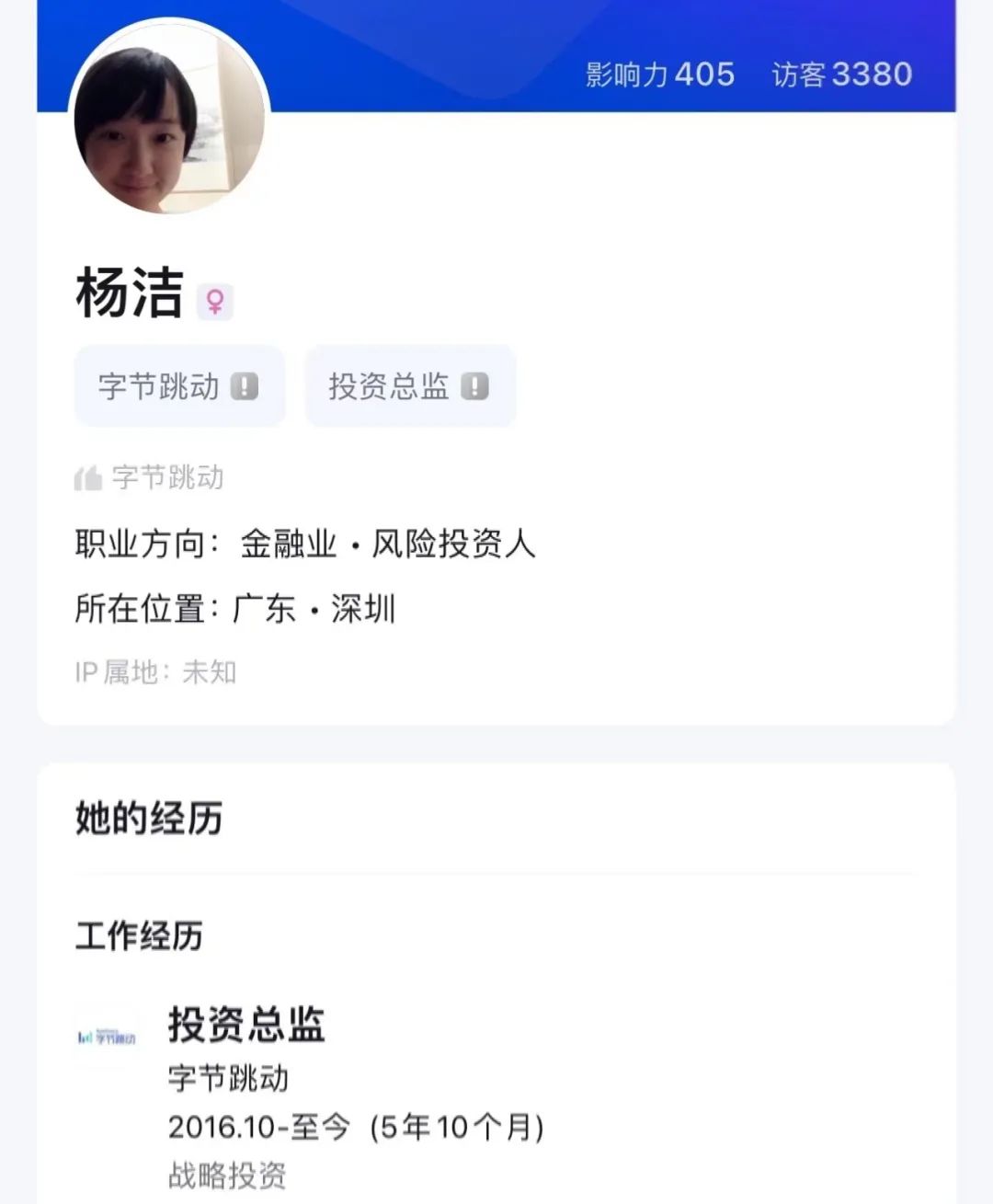 在脈脈上,楊潔的簡(jiǎn)歷依舊停留在“字節(jié)跳動(dòng)投資總監(jiān)”一職: