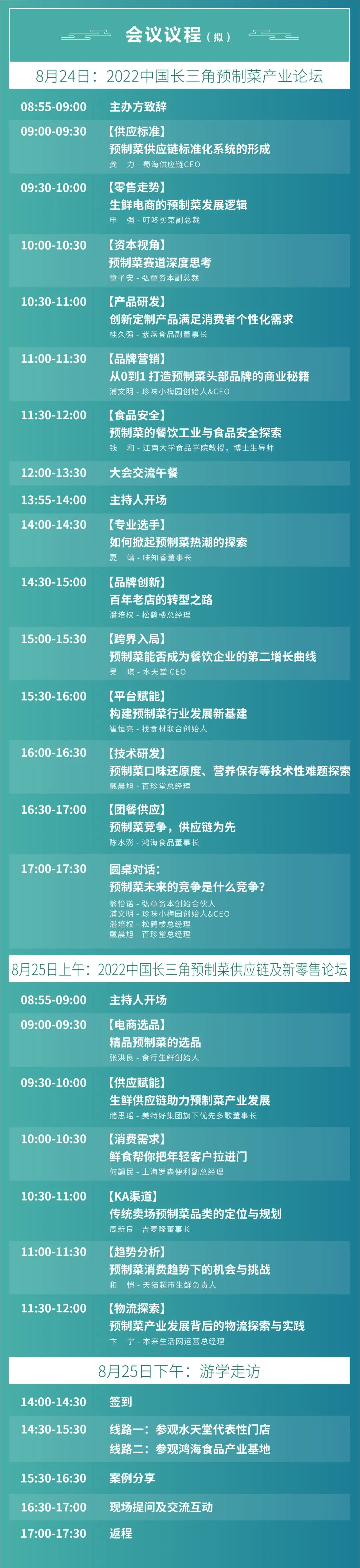 本次大會暨展會將同期舉行企業(yè)游學走訪活動,帶領(lǐng)行業(yè)專業(yè)觀眾走進長三角地區(qū)餐飲品牌名企、預制菜代表企業(yè),論道商業(yè)新機遇!進行有深度、有價值、有收獲的交流,起到互相促進的作用,目前擬定游學路線企業(yè)有:水天堂、鴻海食品。