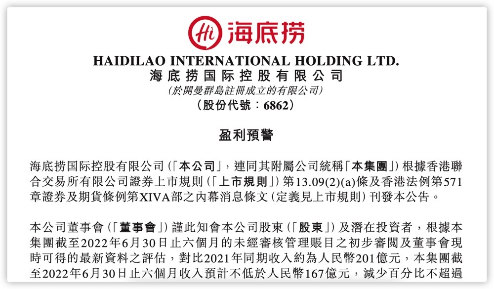 8月14日晚間,海底撈國(guó)際控股有限公司(股份代號(hào):6862)發(fā)布2022年上半年盈利預(yù)警。公告顯示,截止2022年6月30日止六個(gè)月中,海底撈收入預(yù)計(jì)不低于人民幣167億元,對(duì)比2021年同期收入約人民幣201億元,減少百分比不超過(guò)17%。