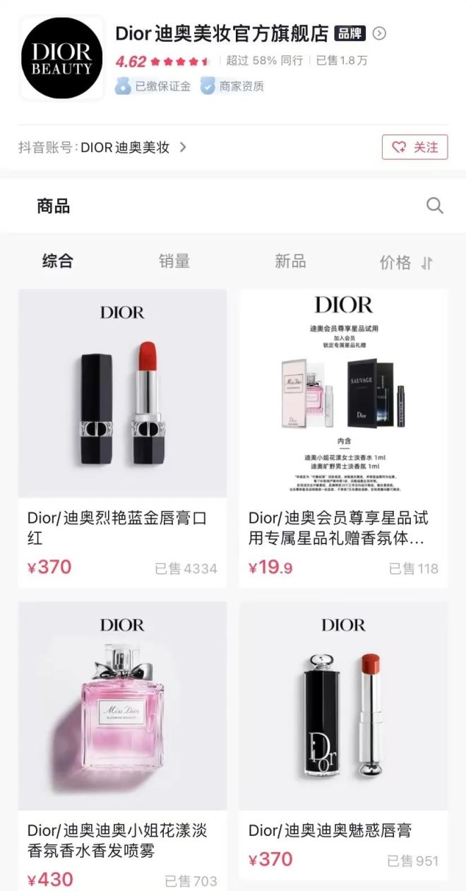 7月1日,Dior美妝抖音官方賬號開啟直播賣貨,同時(shí)也標(biāo)志著該品牌正式登陸抖音電商,主要發(fā)售香水、美妝和套裝等產(chǎn)品,售價(jià)在60元至38000元不等。