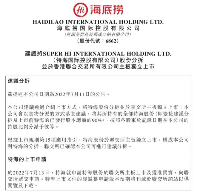 前不久,海底撈還因一則資本運(yùn)作公告引發(fā)市場(chǎng)關(guān)注;厮輥(lái)看,7月11日晚,海底撈曾公告稱,公司正考慮將海外業(yè)務(wù)運(yùn)營(yíng)主體Super Hi International Holding Ltd.(特海國(guó)際控股有限公司)的股份進(jìn)行實(shí)物分派方式的分拆及以介紹上市方式于港交所主板單獨(dú)上市之可能性。