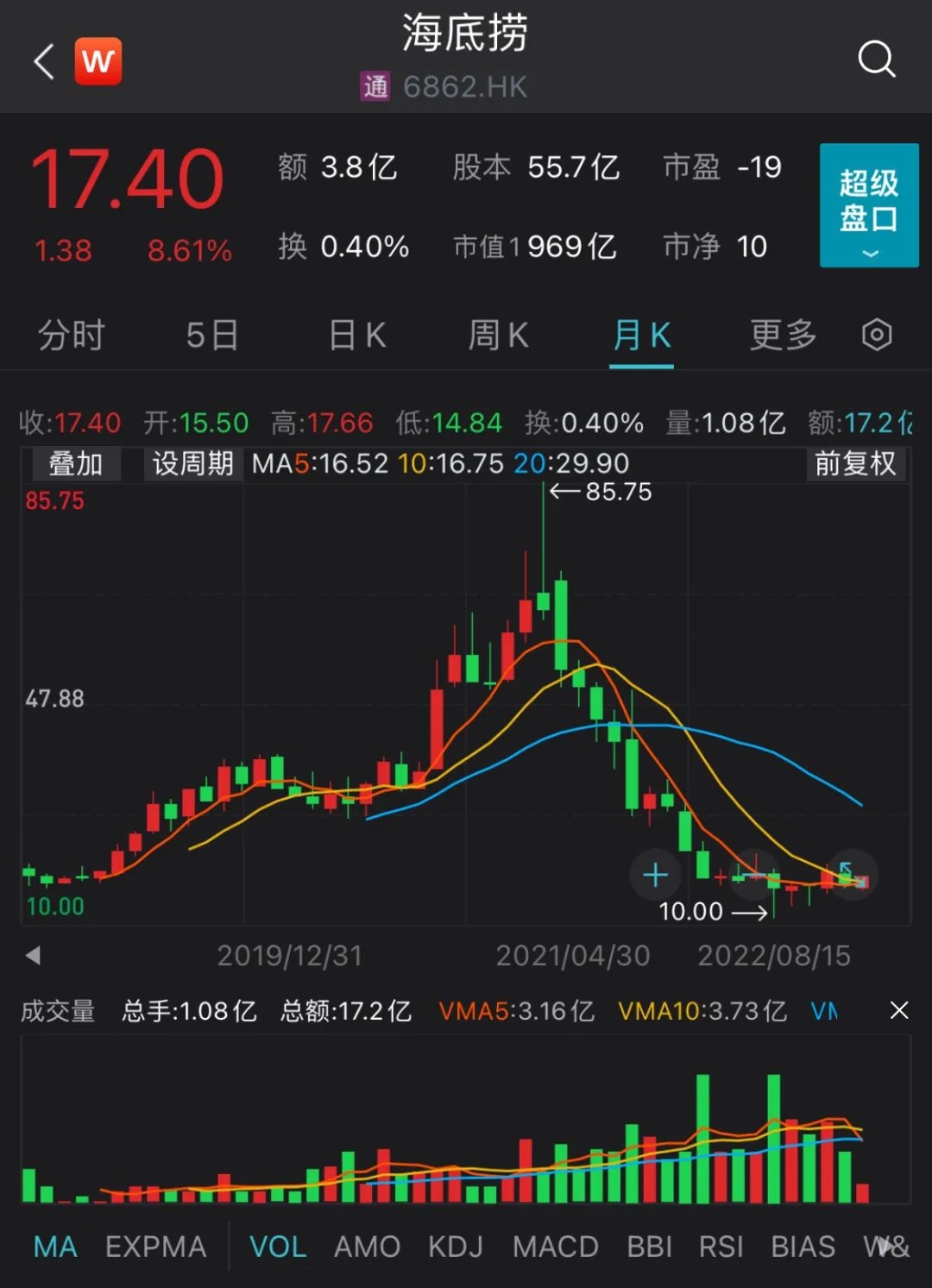 據(jù)中國(guó)基金報(bào),海底撈股價(jià)今年以來(lái)也繼續(xù)低迷,自去年2月高點(diǎn)算起,最高跌幅達(dá)到83%,一度高達(dá)4800億港幣的市值如今已不足千億。