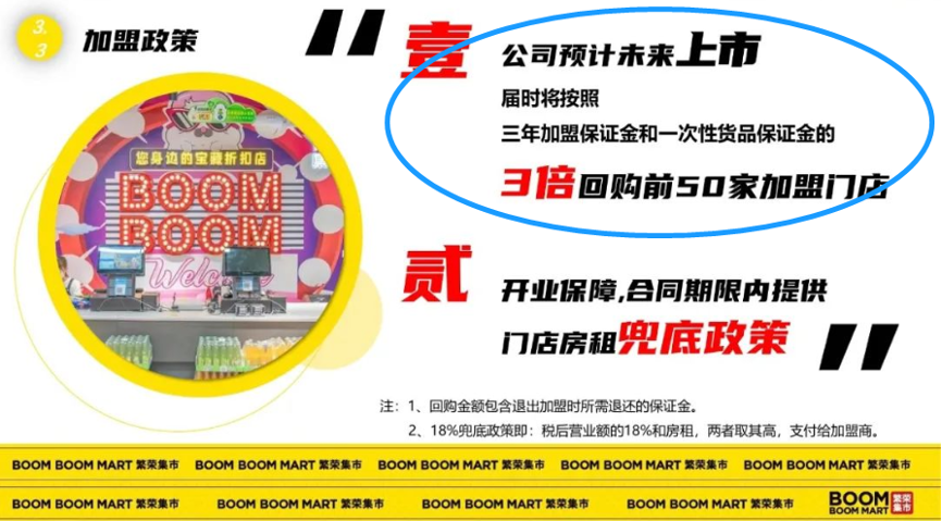 在2021年11月的招商公告中,繁榮集市甚至還透露了IPO計劃,公告表示,公司上市后將按照3年加盟保證金和一次性貨品保證金的3倍,回購前50家加盟門店。