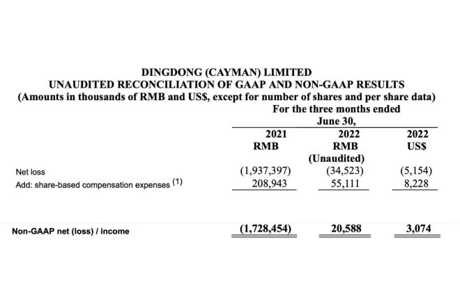 凈虧損方面,不按美國(guó)通用會(huì)計(jì)準(zhǔn)則(Non-GAAP),叮咚買菜2022年第二季度凈利潤(rùn)為2060萬(wàn)元,2021年同期凈虧損17.285億元。