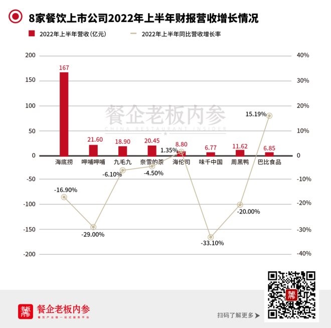 遭遇業(yè)績(jī)滑坡的不止海底撈和呷哺呷哺,今年上半年,餐飲上市公司的整體情況都不容樂(lè)觀(guān),已經(jīng)公布業(yè)績(jī)的餐飲上市公司,尚沒(méi)有一個(gè)能夠?qū)崿F(xiàn)營(yíng)收凈利潤(rùn)雙漲的。 內(nèi)參君整理了一番后發(fā)現(xiàn),在疫情頭兩年,雖說(shuō)整體營(yíng)收和凈利潤(rùn)下降了一定幅度,但還能夠“勉強(qiáng)盈利或是實(shí)現(xiàn)盈虧平衡”的上市企業(yè),在今年上半年也都撐不住了。 >>>先看營(yíng)收數(shù)據(jù) 相比2021年上半年增長(zhǎng)的,只有海倫司和巴比食品兩家。 海倫司曾一度憑借憑借平價(jià)、低價(jià)啤酒吸引二三線(xiàn)城市年輕消費(fèi)者,一度喊出2023年將計(jì)劃開(kāi)至2200家酒館門(mén)店。但今年已經(jīng)陷入了虧損泥潭,半年財(cái)報(bào)中營(yíng)收雖比去年同期有所增長(zhǎng),但僅1.35%的增幅,掩蓋不了“凈虧損3億”這一巨大數(shù)額。而回顧整個(gè)2021年,海倫司僅虧損2.3億元。 所以,拋開(kāi)海倫司這個(gè)看似營(yíng)收略微增長(zhǎng)、實(shí)則虧損3億的海倫司外,營(yíng)收實(shí)現(xiàn)真正增長(zhǎng)的恐怕只有巴比一家。 2021年,海倫司的負(fù)債達(dá)14.1億 海倫司·越,小吃+燒烤+啤酒,在艱巨的環(huán)境之中誕生 >>>再看凈利潤(rùn) 2022年上半年9家上市餐企(為上圖所示上市餐企)中,僅有九毛九、周黑鴨、巴比食品實(shí)現(xiàn)了盈利,其余企業(yè)(包括海里撈和呷哺呷哺),全部虧損。 如果將九毛九、周黑鴨這一盈利數(shù)據(jù)和2021年上半年對(duì)比的話(huà),可以看出,九毛九2022年上半年凈利潤(rùn)0.55億 ,比去年同期虧損增幅達(dá)70.4%;周黑鴨上半年凈利潤(rùn)0.15億,比去年同期虧損增幅達(dá)93.4%。 這也意味著,在“疫情陰影不散,消費(fèi)下行不斷”的摧殘下,盡管艱難前行,但兩家企業(yè)遠(yuǎn)沒(méi)有達(dá)到去年同期的盈利水平。 更“難過(guò)”的是呷哺呷哺、奈雪的茶、海倫司、味千(中國(guó)),對(duì)比去年同期數(shù)據(jù),凈利潤(rùn)虧損增幅達(dá)到495.8%、244.8%、235.8%、321.3% >>>最后看門(mén)店數(shù)量 2022年上半年,在這幾家上市企業(yè)中,門(mén)店數(shù)量增速最快的要數(shù)奈雪的茶和海倫司莫屬。奈雪的茶在上半年新增142家、海倫司新增248家,其余企業(yè)的門(mén)店擴(kuò)張速度均有所放緩,尤其是海底撈,停止“狂飆”的危險(xiǎn)后,上半年新增門(mén)店僅有15家。 目前海底撈共有2193家門(mén)店,其中,1251家正常營(yíng)業(yè),42家處于暫停營(yíng)業(yè)狀態(tài)。 不論是海底撈的“啄木鳥(niǎo)”計(jì)劃、海倫司公告稱(chēng)“對(duì)100余家酒館門(mén)店進(jìn)行調(diào)整”,還是奈雪公告中給出的“因門(mén)店數(shù)目增加,本集團(tuán)在該期間內(nèi)門(mén)店人力、租金等相對(duì)固定成本的金額相應(yīng)增加”。 這些在疫情下進(jìn)行開(kāi)關(guān)門(mén)店“大動(dòng)作”的企業(yè),或多或少在盈利方面都受到了不小的影響。 03 逆境中的驚喜: 巴比食品和瑞幸咖啡 在一片慘烈中,巴比食品和瑞幸咖啡,算是兩束“希望之光”。 “包子第一股”扣非凈利潤(rùn)增長(zhǎng) 卻難逃“增收不增利”的尷尬 半年報(bào)顯示,公司扣非凈利潤(rùn)同比增加61.23%(2021年上半年凈利潤(rùn)57,724,027.98元;2022年上半年凈利潤(rùn) 93,068,384.70元),扣除非經(jīng)常性損益后的基本每股收益同比增加65.22%。在巴比食品看來(lái),營(yíng)收增長(zhǎng)、原材料成本下降、毛利率提高,都是導(dǎo)致公司扣非凈利潤(rùn)增長(zhǎng)的原因。 然而,在營(yíng)業(yè)收入同比增長(zhǎng)15.19%的情況下,公司歸母凈利潤(rùn)卻同比下降44.18%。增收不增利的原因,出在對(duì)外投資上。 熱衷投資的“包子第一股”,間接持有東鵬飲料0.5%的股份。去年5月底,東鵬飲料順利登陸上交所主板,巴比食品也“大賺一筆”:對(duì)東鵬飲料的間接投資,致使其當(dāng)期公允價(jià)值變動(dòng)增益近2億元。 隨后,東鵬飲料股價(jià)震蕩走低,對(duì)巴比食品影響不小。對(duì)此,巴比食品董秘辦官方解釋為:實(shí)際上這筆投資還是掙錢(qián)的,只是目前還沒(méi)有到回收期,股份尚未出售,所以計(jì)入公允價(jià)值的賬面浮動(dòng)會(huì)影響凈利潤(rùn)的真實(shí)表現(xiàn)。 此外,七成收入依賴(lài)加盟、門(mén)店增速持續(xù)下降、食品安全投訴等問(wèn)題,對(duì)于包子第一股也是極大考驗(yàn)。 東鵬飲料股價(jià)上半年整體下行 導(dǎo)致巴比食品持有的金融資產(chǎn)公允價(jià)值降低 “起死回生”的瑞幸 從魔幻退市到凈收入增長(zhǎng)72.4% 2022年8月8日,瑞幸咖啡公布了2022年第二季度財(cái)報(bào)。得益于爆款產(chǎn)品連續(xù)推出、門(mén)店持續(xù)高速擴(kuò)張,以及交易客戶(hù)數(shù)的穩(wěn)步提升,瑞幸咖啡本季度總凈收入增長(zhǎng)72.4%(2022年第一季度收入19.133億元,2022年第二季度收入32.987億元)。自營(yíng)門(mén)店同店銷(xiāo)售增長(zhǎng)率達(dá)到41.2%,自營(yíng)門(mén)店層面利潤(rùn)率達(dá)30.6%。 同時(shí),公司持續(xù)加快門(mén)店擴(kuò)張步伐,本季度凈新增615家門(mén)店,門(mén)店總數(shù)量達(dá)到7195家。在產(chǎn)品方面,公司本季度共推出34款新品,其中椰云拿鐵自四月推出至二季度末已賣(mài)出超過(guò)2400萬(wàn)