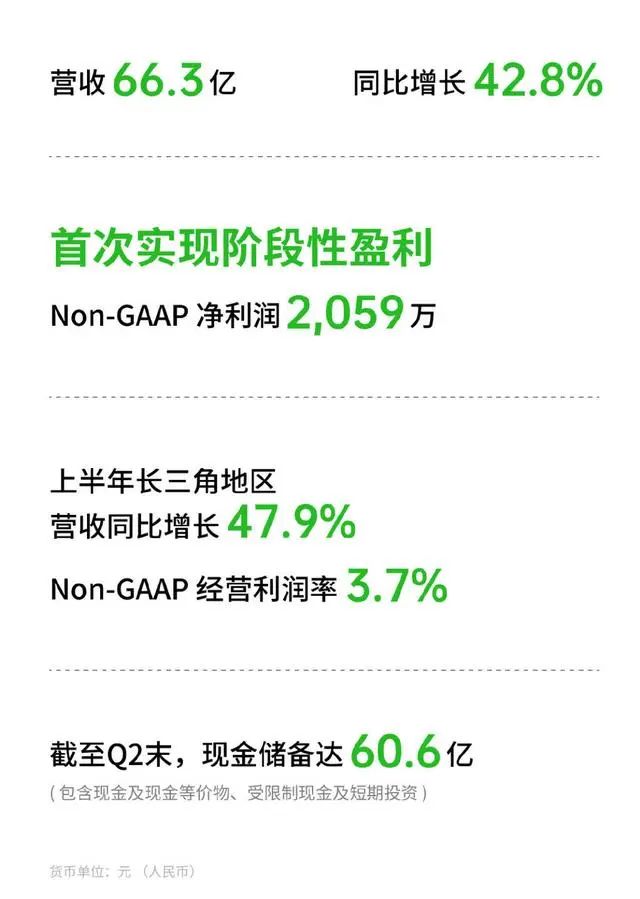 最新財(cái)報(bào)數(shù)據(jù)顯示,叮咚買菜該季度實(shí)現(xiàn)營(yíng)收66.3億元,同比去年增長(zhǎng)42.8%;Non-GAAP凈收入為2060萬(wàn)元人民幣。今年上半年,長(zhǎng)三角區(qū)域營(yíng)收同比增長(zhǎng)47.9%,并實(shí)現(xiàn)了3.7%的正向經(jīng)營(yíng)利潤(rùn)率。