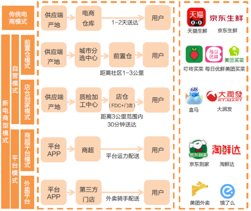 高客單價(jià)+高訂單密度+高履約效率,苛刻的盈利條件讓行業(yè)愈發(fā)關(guān)注前置倉(cāng)模式的價(jià)值鏈,而前置倉(cāng)模式的價(jià)值鏈主要包括上游采購(gòu)、區(qū)域處理中心、前置倉(cāng)、用戶四大組成部分。