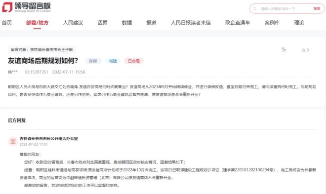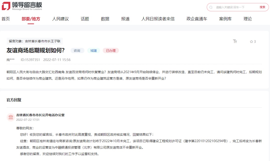 聯(lián)商快訊:近日,有網(wǎng)友咨詢關(guān)于長春市人民大街與自由大路交匯處的友誼商場裝修改造后的規(guī)劃問題。官方回復稱原友誼商店計劃將于2022年10月末完工,但完工后將變?yōu)殚L春新友誼酒店,原友誼商店不會重新開業(yè),商業(yè)的運營方變?yōu)橹腥阢y通投資管理(北京)有限公司。