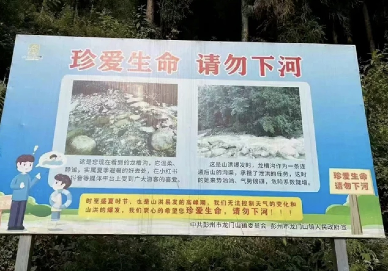 有報道稱,事發(fā)地所在的龍漕溝屬于地質(zhì)災(zāi)害點位,易發(fā)生泥石流、山洪等自然災(zāi)害,尤其是汛期溝內(nèi)容易暴發(fā)齊頭水。龍漕溝片區(qū)面積較大,而在發(fā)生山洪后,還有一些群眾不了解情況,依然在水中嬉戲。
