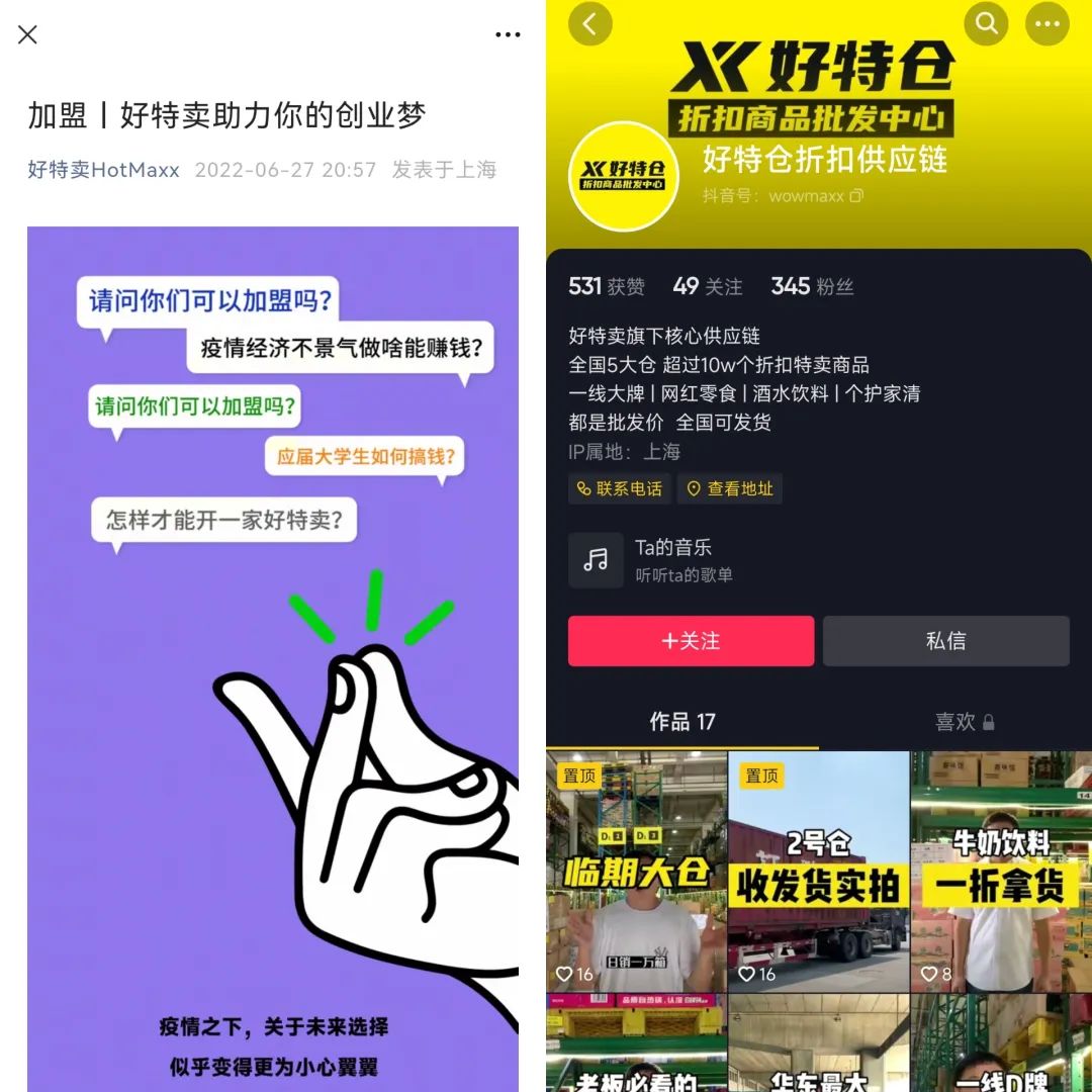 相對應的,好特賣從6月底在官方微信公眾號和各社交平臺發(fā)布了全面啟動加盟的信息,還在抖音開設賬號“好特倉折扣供應鏈”,面向全國開放供應鏈,提供各類折扣商品。