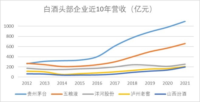 圖:白酒頭部企業(yè)近10年?duì)I收,來(lái)源:Choice金融客戶(hù)端