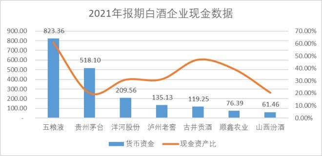 2021年年報(bào)顯示,五糧液貨幣資金余額達(dá)到823.36億元,遠(yuǎn)超其他白酒企業(yè),在整個(gè)消費(fèi)品領(lǐng)域只少于格力電器,在A股市場(chǎng)所有企業(yè)中也能排到52名。如果算上應(yīng)收款,五糧液的資金儲(chǔ)備達(dá)到了千億級(jí),F(xiàn)金資產(chǎn)比達(dá)到了60%,遠(yuǎn)高于其他白酒企業(yè)。