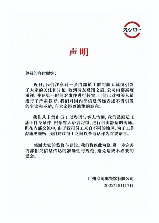 壽司郎表示,公司從未禁止員工以粵語(yǔ)與客人溝通,鼓勵(lì)員工基于自身?xiàng)l件,根據(jù)客人語(yǔ)言習(xí)慣,進(jìn)行自由舒適的溝通。但在內(nèi)部交流中,由于公司員工來(lái)自不同的地區(qū),為了工作溝通更順暢,建議員工之間以普通話作為首要語(yǔ)言。