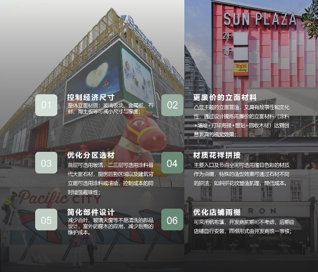 上面所說的策略和方式適用于社區(qū)商業(yè)建筑設計的各個層面,而針對項目的不同設計模塊,我們還總結(jié)了針對性的成本控制建議: