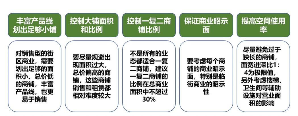 區(qū)域型商業(yè)街對于店鋪的面積段沒有社區(qū)型商業(yè)街敏感。作為社區(qū)型商業(yè)街,店鋪劃分更為苛刻。首先是豐富產(chǎn)品線,劃出足夠的小面積段商鋪,控制大面積店鋪與一復二店鋪的比例。同時也要保證商業(yè)的昭示面和空間使用率。