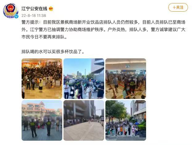 江寧公安在線午間抽調(diào)警力協(xié)助商場維護(hù)秩序,并在微博發(fā)出一則警方提示,誠摯建議市民今日不要再前往排隊(duì),“排隊(duì)喝的水可以買很多杯飲品了”。