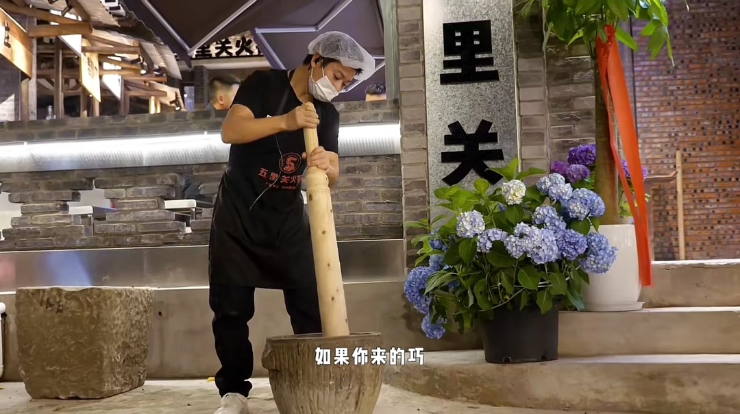 有的火鍋店會(huì)在店外炒料,大型的炒鍋來(lái)回翻騰,香味飄散,很吸引人,像五里關(guān)火鍋,逢到飯點(diǎn),服務(wù)人員就在門(mén)口錘蒜泥、打糍粑,反復(fù)捶打的動(dòng)作,遠(yuǎn)遠(yuǎn)就能看到。
