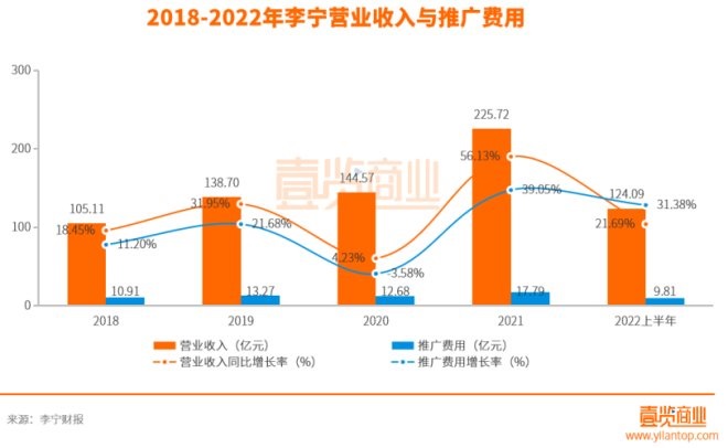 據(jù)李寧2022上半年財(cái)報(bào)顯示,李寧上半年廣告及市場(chǎng)推廣開(kāi)支9.81億元,同比增長(zhǎng)31.38%。與此同時(shí),營(yíng)業(yè)收入124.09億元,同比增長(zhǎng)21.69%。營(yíng)銷(xiāo)費(fèi)用的投入同比增長(zhǎng)超過(guò)營(yíng)業(yè)收入同比增長(zhǎng)近10個(gè)百分點(diǎn)。