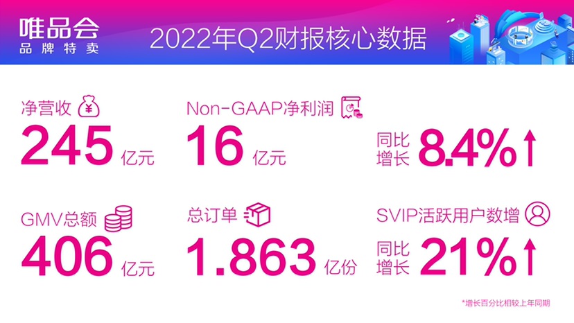 8月19日,唯品會發(fā)布2022年第二季度財報,公司當季實現(xiàn)凈營收245億元,歸屬于公司股東的Non-GAAP凈利潤16億元,同比增長8.4%;利潤水平和整體利潤率均實現(xiàn)同比增長。