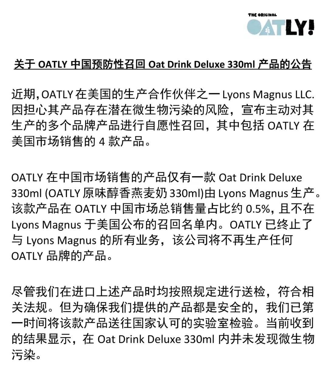 OATLY發(fā)布召回公告:產(chǎn)品檢測(cè)均合格,僅為預(yù)防性措施
