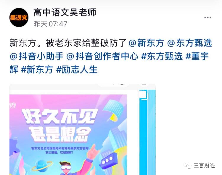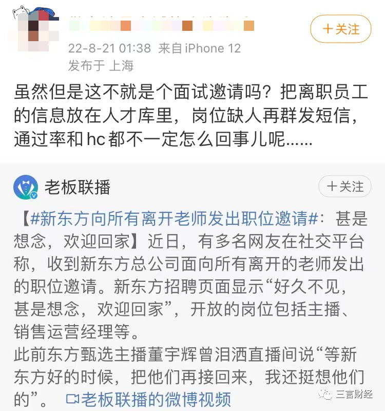 新東方這次對(duì)離職的老師們發(fā)出邀請(qǐng),如果有人愿意回來,說不定藏著另一個(gè)“董宇輝”。就算沒人回來,也賺了一波熱度和口碑。