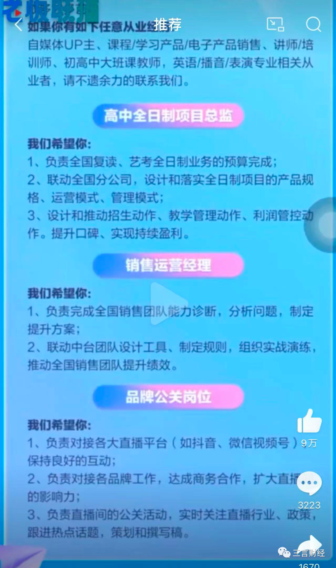 從這四個(gè)銷售崗位看,兩個(gè)直播業(yè)務(wù)崗,兩個(gè)原先的教育業(yè)務(wù)崗,看似很平衡。