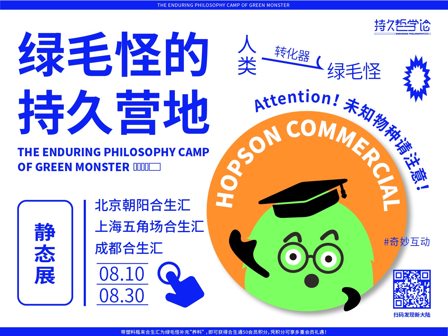 為了喚醒人們對(duì)環(huán)境的保護(hù)意識(shí),深入探索可持續(xù)的生活態(tài)度,8月11日-8月30日期間,合生商業(yè)集團(tuán)聯(lián)動(dòng)旗下北京朝陽(yáng)合生匯、上海五角場(chǎng)合生匯、成都合生匯三大購(gòu)物中心,共同發(fā)起一場(chǎng)“持久哲學(xué)論--綠毛怪的持久營(yíng)地”主題室內(nèi)靜態(tài)展公益活動(dòng)。該活動(dòng)是合生商業(yè)集團(tuán)自有公益潮流品牌「持久哲學(xué)論」的首次線下呈現(xiàn),也是「持久哲學(xué)論」品牌兩款潮流單品的首次面世。