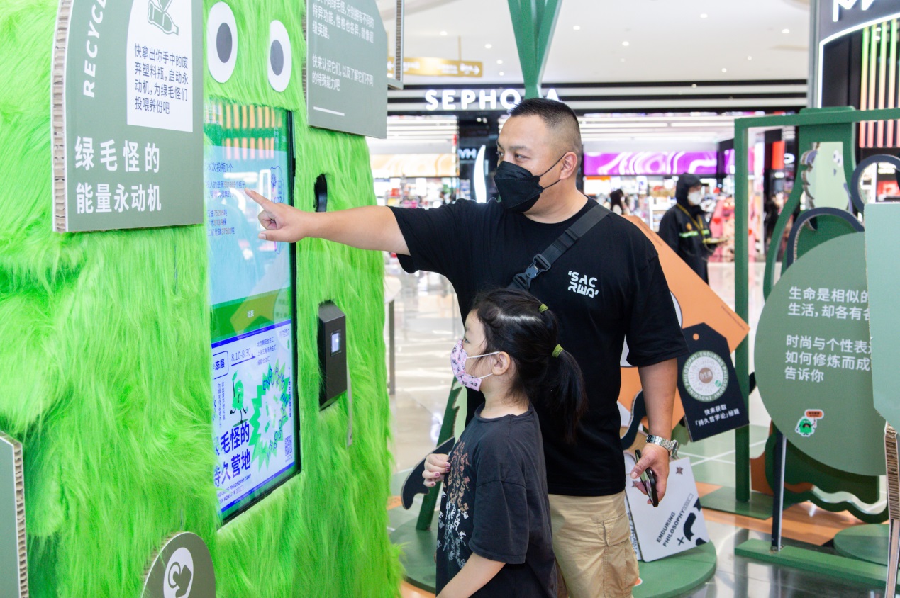 在這里,可以了解到廢棄塑料瓶經(jīng)過再生加工,最終成為潮流產(chǎn)品的「持久哲學(xué)」公益故事。這些形態(tài)各異綠毛怪們生存的養(yǎng)料是地球上最難降解的廢棄塑料,人們可以把剛喝完的塑料瓶投入營(yíng)地中的“能量永動(dòng)機(jī)”,幫助他們維持星球持久運(yùn)轉(zhuǎn)。每投喂1個(gè)瓶子,即可獲取合生通小程序會(huì)員50積分(每人每天100分封頂),這些積分不僅可以折為購(gòu)物金在合生匯購(gòu)物,享受商場(chǎng)多項(xiàng)會(huì)員免費(fèi)服務(wù),還有機(jī)會(huì)獲得停車券以及綠毛怪專門為地球人準(zhǔn)備的“神秘禮物”。