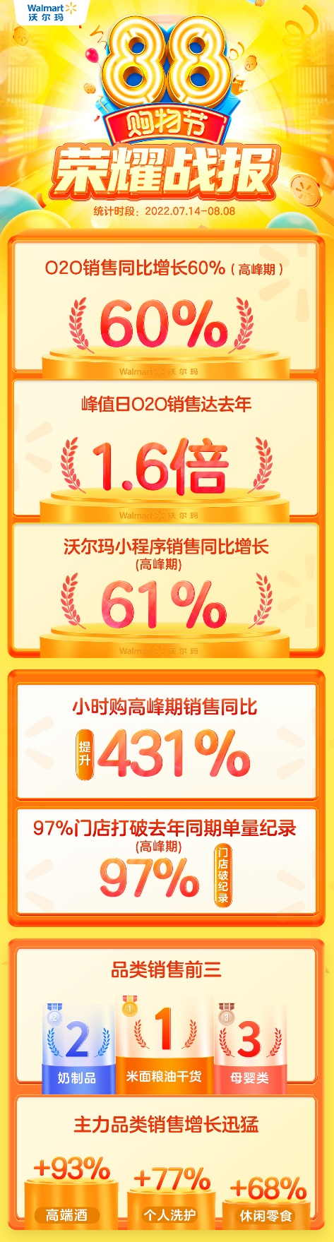 據(jù)沃爾瑪數(shù)據(jù)顯示,“88購物節(jié)”期間,米面糧油等干貨、奶制品、母嬰類商品占據(jù)銷售額前三,顯示了顧客強(qiáng)勁的剛需囤貨需求。多品類也迎來迅猛漲勢:休閑零食同比增長68%,個(gè)人洗護(hù)同比增長77%,高端酒同比增長93%。