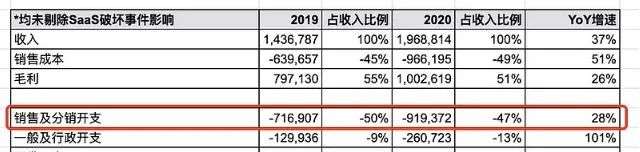 看看微盟在過去兩年的收入與投入,微盟幾乎將其一半的收入作為銷售成本,通過覆蓋式營銷獲取增量的訂單。2018、2019、2020年微盟的銷售費(fèi)用在總收入的占比分別為52%,49.9%,49%。