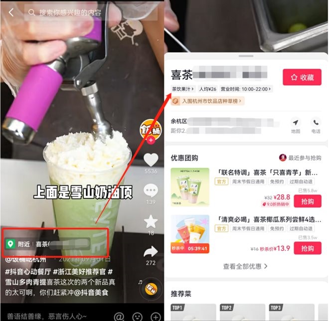 抖音本地生活業(yè)務(wù)的另一組成部分,“到店”業(yè)務(wù),使用的更多是第1、3、6的入口。第1個(gè)入口最為常見,它更偏向于內(nèi)容種草邏輯,商家拍攝短視頻,用戶觀看后被種草,點(diǎn)擊小程序就可以購買相應(yīng)的商家優(yōu)惠券,到店后進(jìn)行核銷;第3和第6個(gè)入口則需要消費(fèi)者有更為明確的消費(fèi)需求,主動(dòng)搜索商家進(jìn)到小程序,或者已經(jīng)進(jìn)到店內(nèi)掃碼,拿到優(yōu)惠。