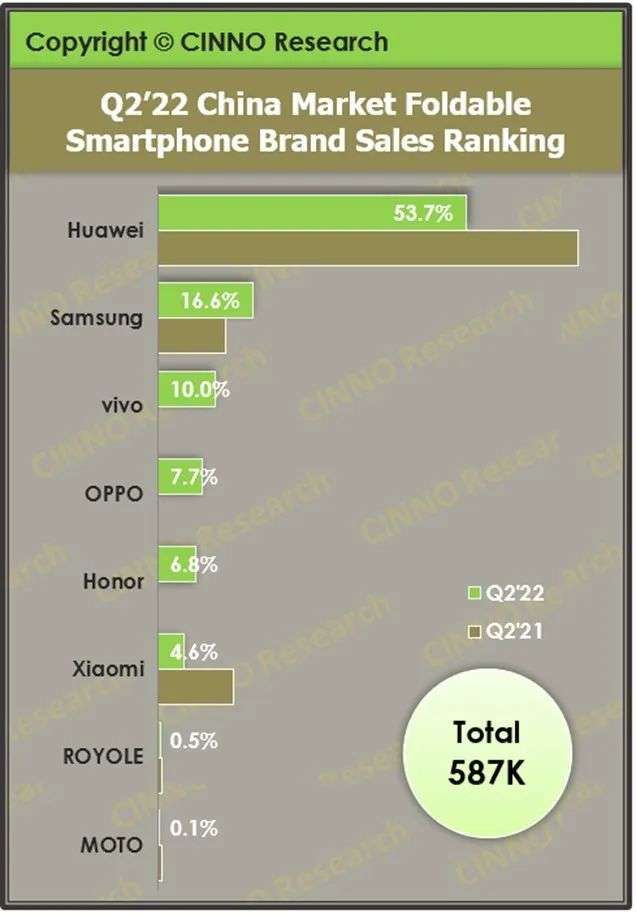 據(jù)CINNO Reserch數(shù)據(jù)顯示,上半年國(guó)內(nèi)折疊屏手機(jī)累計(jì)銷量130萬部,超過了2021全年的116萬部,而Q2同比增幅更是達(dá)到了132.4%。