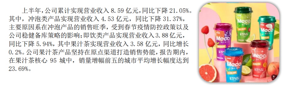 沖泡類(lèi)產(chǎn)品的業(yè)績(jī)下滑明顯,是影響整體營(yíng)收的關(guān)鍵因素。據(jù)半年報(bào)解釋?zhuān)禄闹饕颉跋翟跊_泡產(chǎn)品的銷(xiāo)售旺季,受到春節(jié)疫情防控政策以及公司穩(wěn)健備庫(kù)策略的影響”。