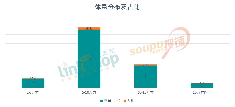 從商業(yè)規(guī)模的分布情況上看,規(guī)模在5至10萬方(含5萬方,不含10萬方)數(shù)量最多,占比62%;10至15萬方(含10萬方,不含15萬方)占比約23%;2至5萬方(含2萬方,不含5萬方)占比約10%; 15萬方以上(含15萬方)占比約5%。