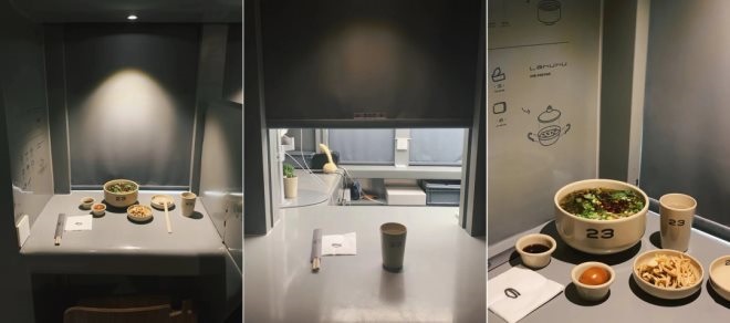 比如北京三里屯太古里的23坐面館,工業(yè)風(fēng)、極簡、未來數(shù)字感,創(chuàng)新型的獨(dú)食面館,左鄰右舍被完全隔斷的座位,通過小程序掃碼點(diǎn)單,上菜時(shí)面前的簾子自動(dòng)拉開到三分之一位置,消費(fèi)者與服務(wù)人員也互不相見,真正實(shí)現(xiàn)“社恐眼里的一人食”。