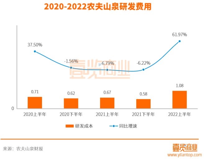 另一方面,加大研發(fā)費(fèi)用的投入。農(nóng)夫山泉管理層在業(yè)績交流會(huì)上提到,依然堅(jiān)定看好無糖茶飲料的增長。雖然當(dāng)前國內(nèi)無糖茶飲料市場競爭日趨激烈,但農(nóng)夫山泉高管表示,無糖茶飲料不論是原茶萃取還是灌裝技術(shù),相比其他飲料,需要更高的技術(shù)壁壘,也需要企業(yè)不斷進(jìn)行技術(shù)創(chuàng)新和技術(shù)研發(fā)。從數(shù)據(jù)來看,2022年上半年,農(nóng)夫山泉在研發(fā)方面的投入也在持續(xù)增長。