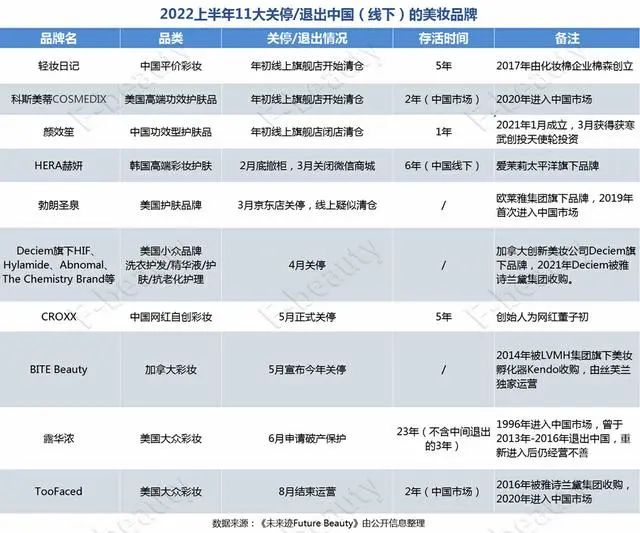 2022年上半年關(guān)停/退出中國(guó)市場(chǎng)的美妝品牌