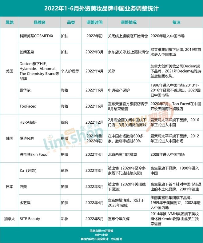 與國貨的崛起相比,外資大眾品牌就沒那么好過了,消費時代和環(huán)境的巨變讓許多外資美妝品牌紛紛做出了業(yè)務(wù)上的調(diào)改。據(jù)聯(lián)商網(wǎng)不完全統(tǒng)計,僅今年上半年,就有12家企業(yè)做出業(yè)務(wù)調(diào)整。其中包括數(shù)家進入中國市場多年,曾經(jīng)風(fēng)靡一時的歐美和日韓老牌美妝,如水芝澳、露華濃等。