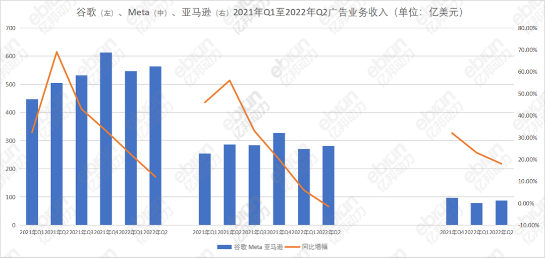 廣告業(yè)務(wù)占總營收達(dá)98%的Meta也感受到了變化。Meta廣告業(yè)務(wù)收入的增速在2021年后半年開始減緩,前兩個季度還能保持46%、56%的增長速度,到了三、四季度,分別僅達(dá)到了33%、20%。今年一季度,Meta的廣告業(yè)務(wù)收入開始以6%單位數(shù)增長,而到了二季度,則出現(xiàn)了同比下降。