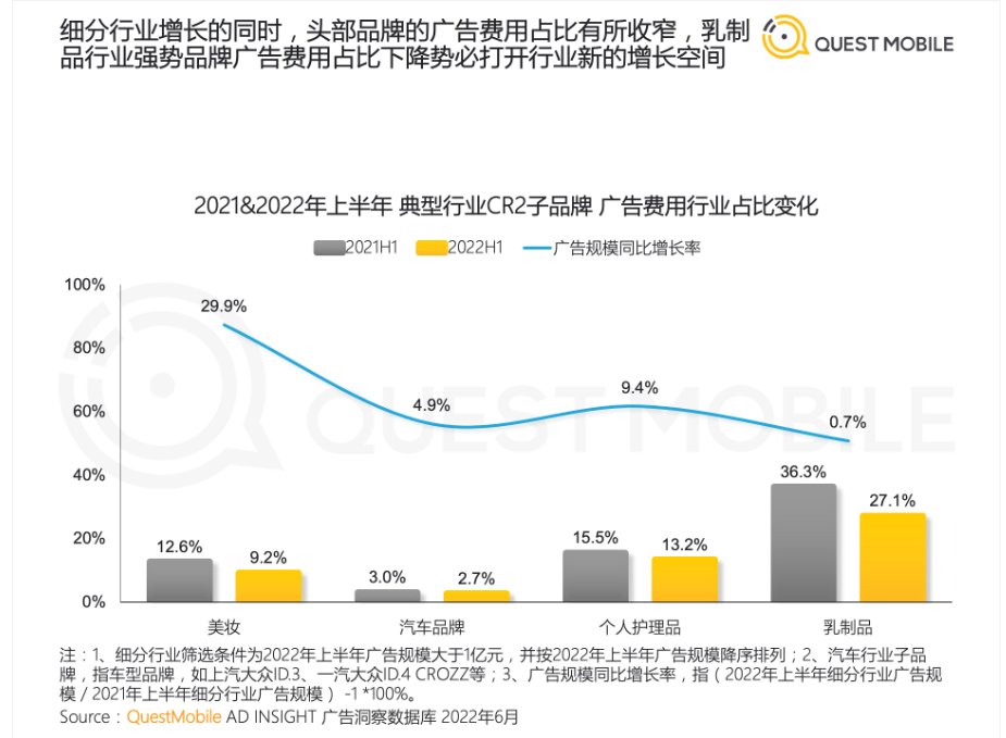 QuestMobile報(bào)告顯示,今年上半年互聯(lián)網(wǎng)廣告投放品牌數(shù)量已經(jīng)同比下降了38.3%。部分行業(yè)頭部品牌廣告費(fèi)用占比有所收窄,如美妝、汽車品牌、個人護(hù)理品、乳制品行業(yè)的TOP2子品牌廣告費(fèi)用在行業(yè)中的占比都在同比下降。