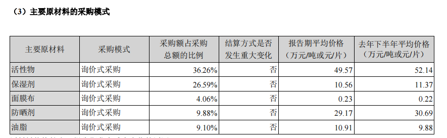 財報還顯示,貝泰妮的主要原材料價格總體呈下降趨勢。其中采購占比達72.73%的活性物、保濕劑、防曬劑價格分別為49.57萬元/噸、10.56萬元/噸、29.17萬元/噸,分別同比下降5%-7%。
