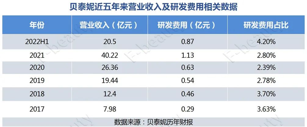 此外,上半年貝泰妮的研發(fā)投入為8756.59萬元,同比大增85.17%。對比過去5年數(shù)據(jù)看,研發(fā)投入金額及占營業(yè)收入比例持續(xù)上升。