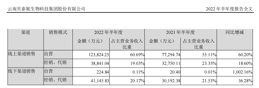 從渠道看,貝泰妮在2022年上半年保持雙線高增長態(tài)勢——進一步提升線上銷售占比,同時線下渠道增速也頗為可觀。