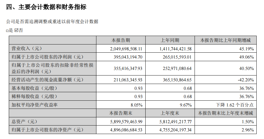 首先,報告期內(nèi),貝泰妮錄得實現(xiàn)營業(yè)收入20.50億元,同比大漲45.19%;實現(xiàn)營業(yè)利潤4.67億元,同比增長47.06%;歸屬于上市公司股東的凈利潤實現(xiàn)3.95億元,同比增長45.06%。